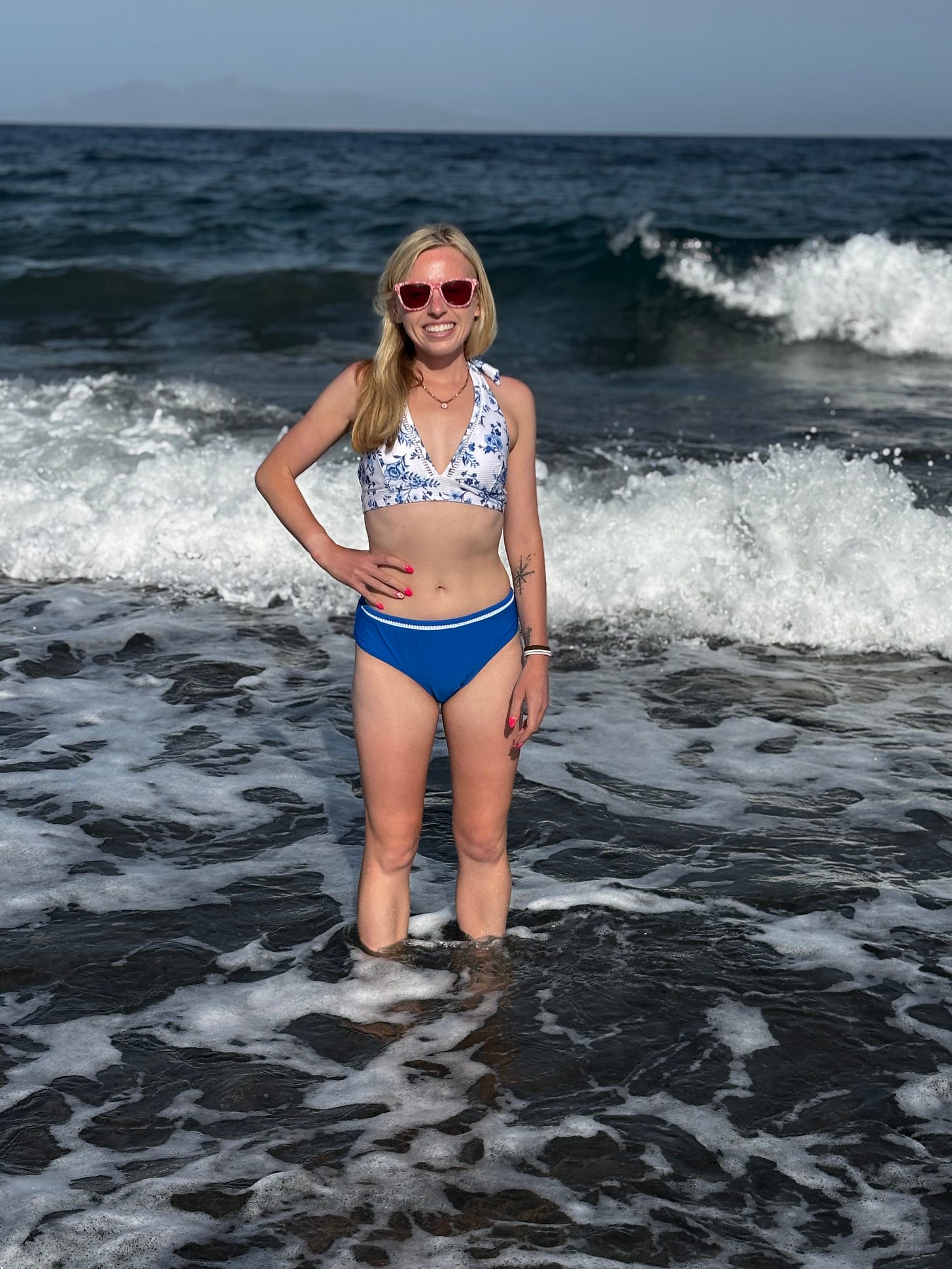Although called a "sand" beach, it’s actually made up of tiny black pebbles, which took some getting used to underfoot. We attempted a dip in the ocean but quickly discovered that the seabed was uneven and rocky, and with the high tide, it became difficult (and slightly risky) to fully get in. As a runner, I’m always conscious of staying injury-free, so we opted to wade in carefully and enjoy the scenery from the shore.