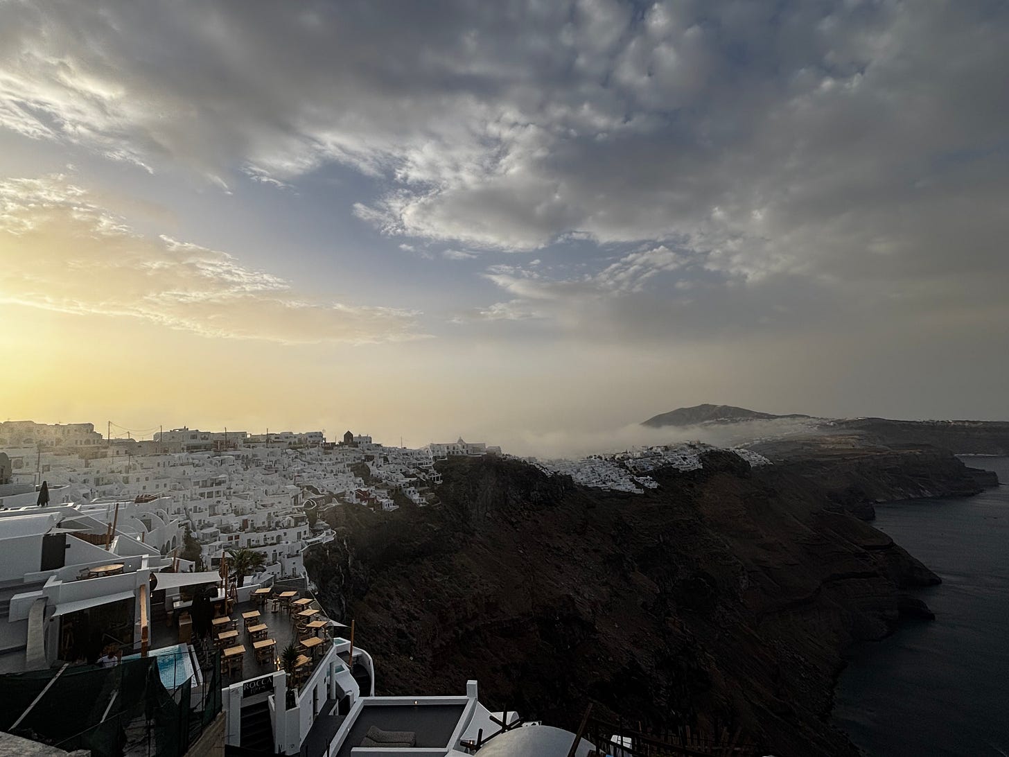 I started the morning with a short walk to explore more of our surroundings. Our hotel was near the island’s main city, Fira, and the early morning fog hanging over the buildings and spilling off the edge of the caldera created a scene that was both mysterious and beautiful.