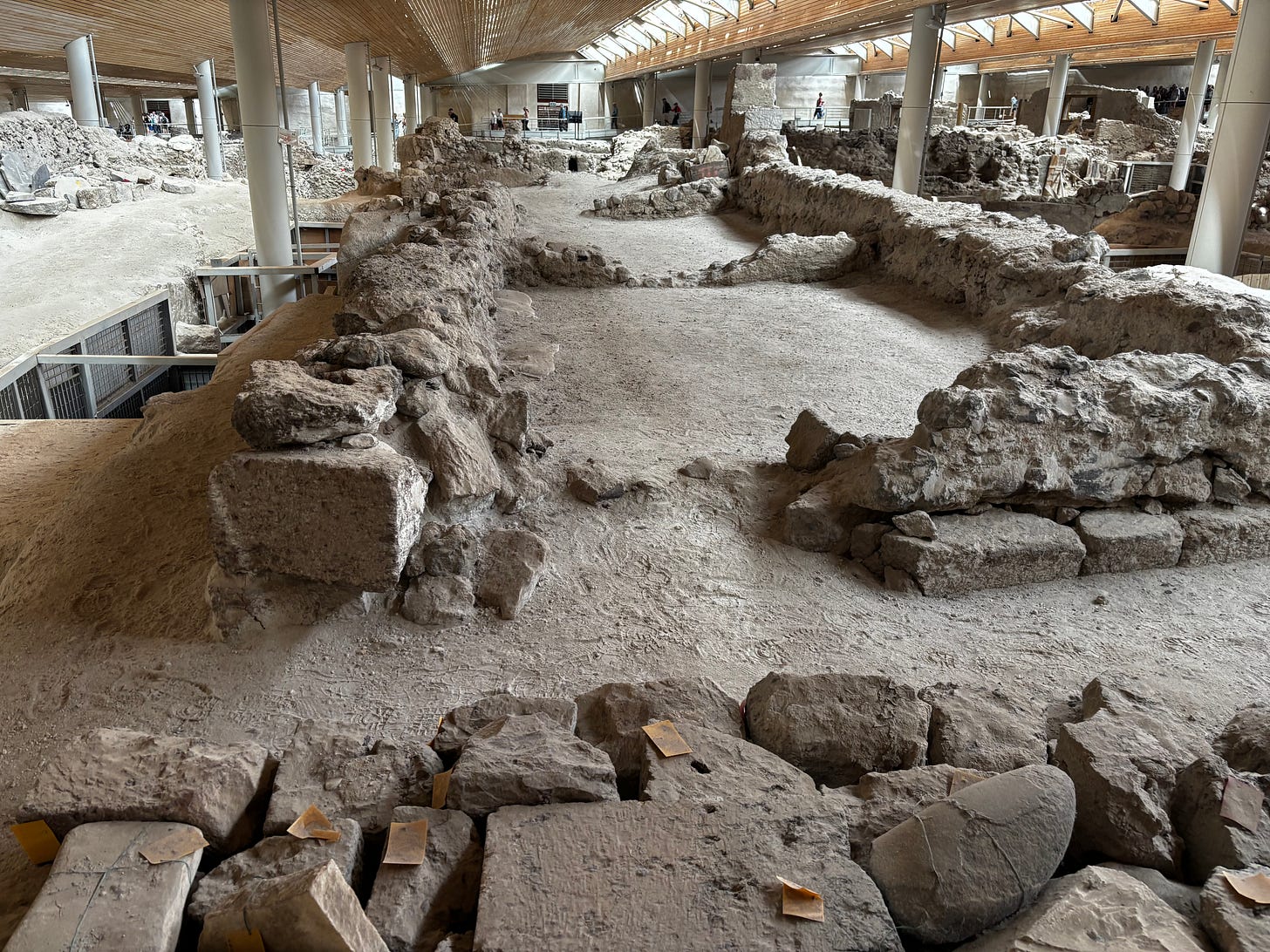 Akrotiri was buried in volcanic ash following the massive Thera eruption around the mid-16th century BCE, which preserved its buildings, frescoes, and artifacts in extraordinary condition. To protect and preserve this historical treasure, a modern roofed structure now surrounds the site, allowing visitors to walk through the ancient city under shelter from the elements.