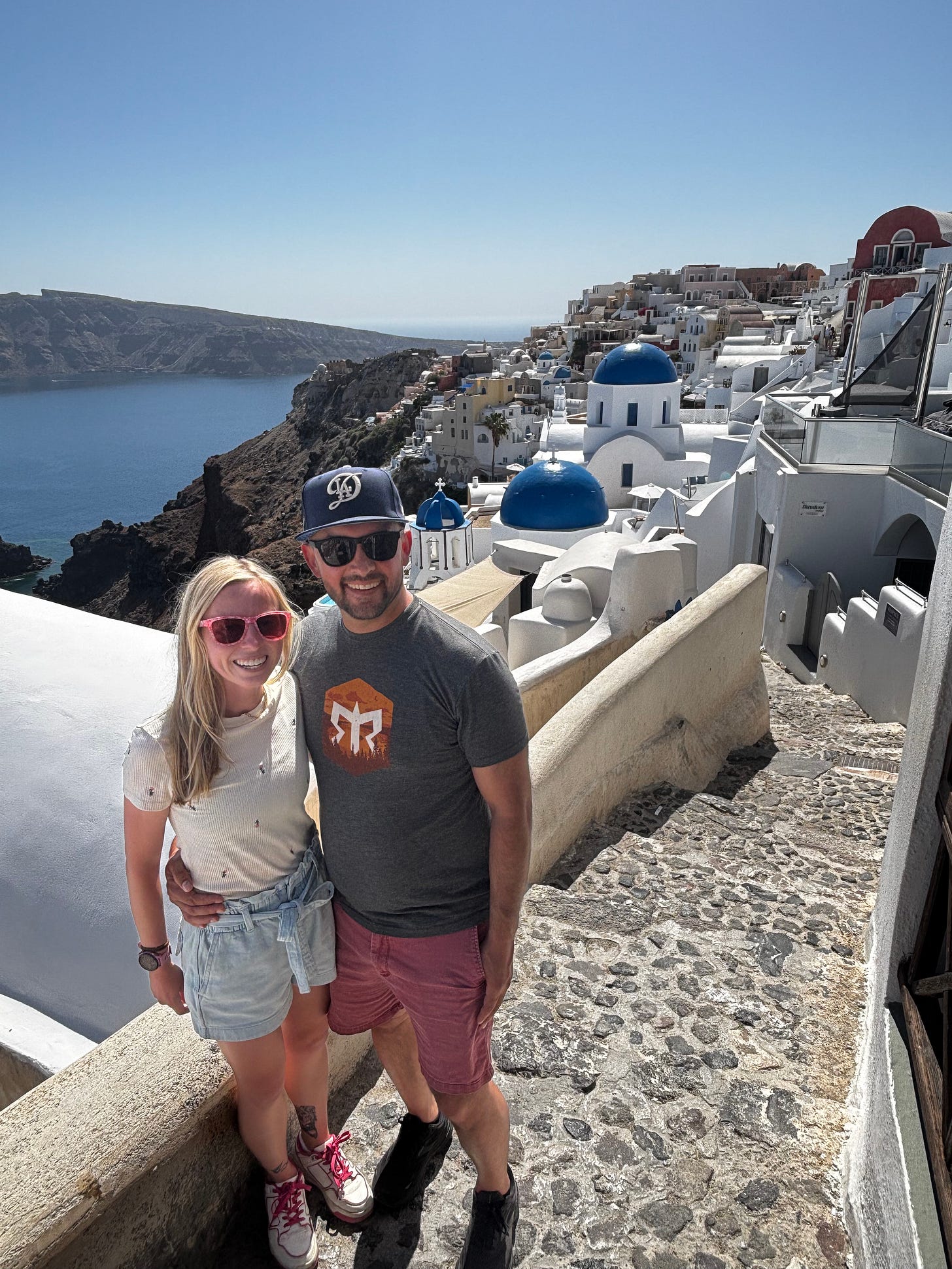 After a brief guided tour, we had time to wander on our own. We stopped to take photos by the famous blue-domed churches and picked up a beautiful piece of artwork to bring home. We always try to find a special piece of art to commemorate each trip—a keepsake that helps preserve the memory for years to come. (More on the story behind this piece in a later post!)